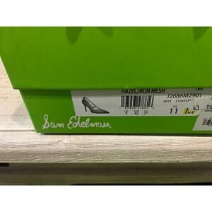 Keywords: Sam Edelman, women's pumps, gray heels, stiletto, party shoes, cocktail, mesh upper, pointed toe, cushioned insole, embellished heels, slip-on, high heel, elegant footwear, size 11.