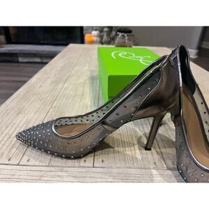 Elevate your style with these stunning Sam Edelman pumps, perfect for any party or cocktail event. Crafted with a sleek gray mesh upper, these heels feature a high stiletto design that adds a touch of elegance to any outfit. The pointed toe and slip-on closure offer a chic and effortless look, while the cushioned insole ensures comfort throughout the night. Embellishments add a hint of sparkle, making these pumps a standout choice for special occasions. New in box.