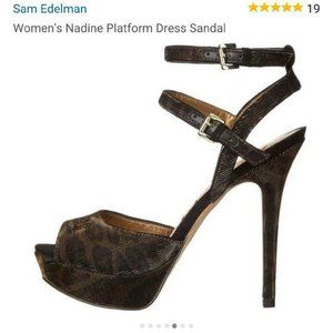 This sky-high platform lets any fashionista truly reach for the stars! The Nadine sandal from Sam Edelman gives you instant confidence and style. Leopard printed glitter fabric upper (black and bronze). Ankle & instep straps with adjustable buckles. Round peep toe.SZ 6 B VERY LITTLE WEAR ON SOLES ONLY