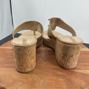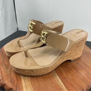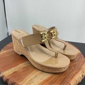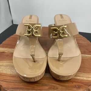 Sam Edelman Yardlie Emblem Platform Wedge Sandals beige patent leather Sz 8