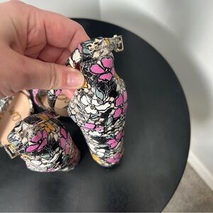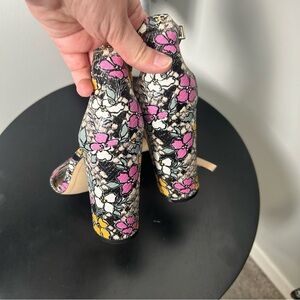 Black and gray snake print patrern throughout with floral detailing. Sticker residue on right shoe (heel area). Size 7. Tons of love left!
