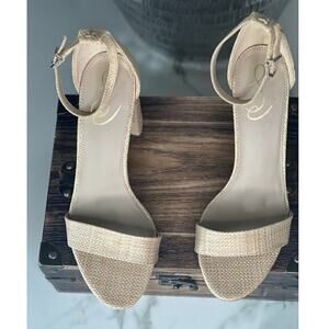 These NWOB Sam Edelman Yaro Heels feature an open-toe silhouette, an ankle strap with buckle closure, a lightly padded, fixed footbed, and a wrapped heel. There are some slight signs of wearing on the sole (see last two pics), otherwise, these are in excellent condition.