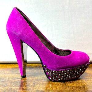 Make a bold statement with these Sam Edelman York platform pumps in luxe purple suede. Designed with edgy studded detailing across the platform, these high heels combine glam style with rocker-chic energy. Perfect for nights out, parties, concerts, or anyone looking to stand out.