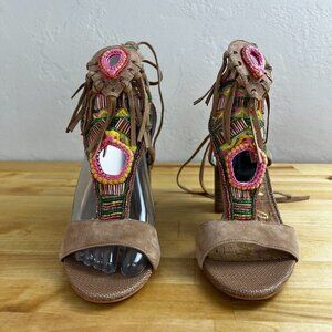 Sam Edelman Yvette Ankle Wrap Beaded Fringe Embellished Boho Festival Sandals Heels Size 7.5