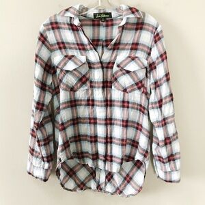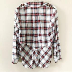 Sam Edelman Zip Shoulder Plaid Shirt in light blue with red. Size XS. Full button up shirt. Sleeves can be rolled and buttoned. Front pocket detail. Zipper detail at shoulders can be zipped or unzipped to reveal shoulders. High low hem. Retailed for $99. Pre-owned, excellent used condition (there is writing on the interior tag).