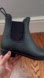 These are sleek black ankle rain boots designed in a classic Chelsea style. Made from waterproof rubber material, they feature elastic side panels for easy slip-on and removal, along with pull tabs at both the front and back for convenience. The boots have a smooth matte finish, a rounded toe, and a low block heel that provides comfort and stability. Simple, stylish, and practical — perfect for rainy days or casual everyday wear.