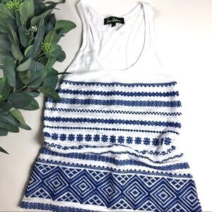 Summary: Racer back style tank with festival style embroidery. Blue and White.