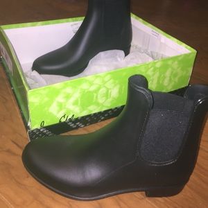 Brand new Black matte boots with a tiny heel, the box says they are size 5 but inside the show itself they say size 6. They are waterproof, never have been worn. They are rain boots but can also be worn as simple black booties to go really cute with a simple outfit