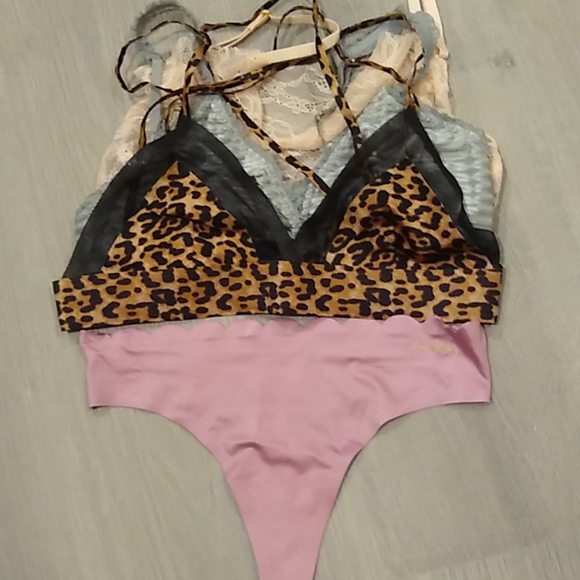 3 Sam Edelman bralettes and 1 thong. None of it ever worn. Leopard print bralette with black mesh details. The moss green bralette is striped velvet and mesh, super pretty and lux feeling. The pink bralette is really feminine and flirty. And this thong is a really pretty mauve color and soft fabric. Smoke free and clean home. I ship quickly.