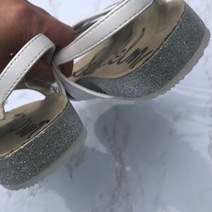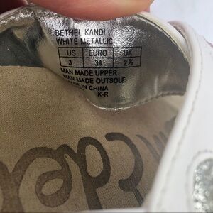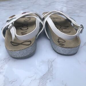 Sam Edelman Bethel Kandi metallic white girl’s sandal shoes. Crisscross design on top with adjustable ankle strap. Straps on top are embellished with adorable colorful hearts. Excellent condition. Girls size 3. See pics for measurements. Same day ship! Perfect for summer!!