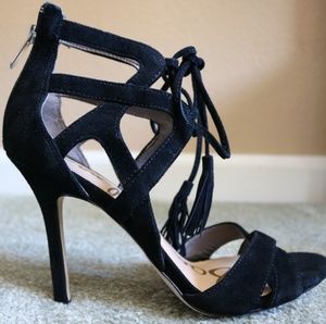 Sam Edelman black strappy heels laces with tassel. Barely worn, good condition.