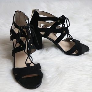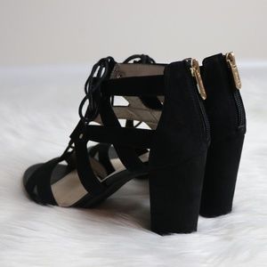 Excellent condition. Block heels. Lace up tie in the front. Zipper back closure. Black Suede.