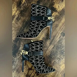 Women’s Sam Edelman studded embellished boot/bootie. Mila model. Side zip. Gorgeous embellished shoe. Stilletto heel The inside has a gel pad inserted. Beautiful gold tone metal stud accents. A mixture of leather and suede. Very good used condition.
