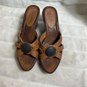 Sam Edelman leather tan platform wedge straps sandals black button accent SZ9.5