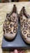 These pretty shoes are a calf hair leather that has been over printed with a leopard print design. There is a woven straw soul with over stitching. Shoes are in excellent condition.