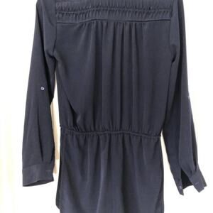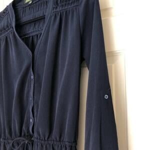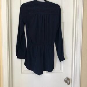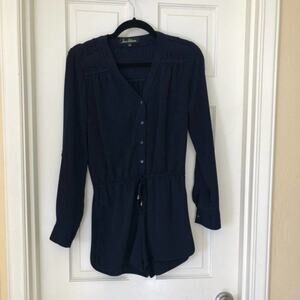Sam Edelman navy long sleeve shorts romper. Top of back has a crocheted lace cinched inset. Elastic waistline. Drawstring waist, button cuffs, v neckline. No holes, stains, or piling. Excellent condition. Smoke free home.