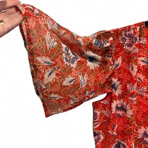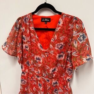 This red and floral dress is beautiful for spring summer and fall. It would be adorable with a denim jacket and sneakers for casual wear or a heel for an event. Flutter shear sleeves. Dress is otherwise fully lined. Somewhat adjustable as you can determine how short you would like it based on the elastic waistband.