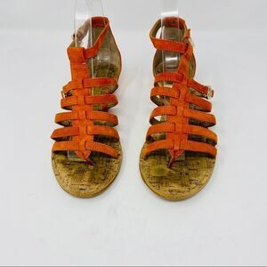 Thong toe - Caged vamp - Logo filigree medallion - Leather construction - Ankle strap with buckle closure - Cork lined lightly padded footbed - Woven wrapped wedge heel - Approx. 1.25" heel