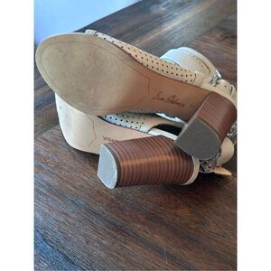 Sam Edelman "Emmie" Block Heels in size 7. I consider these a pale gray color. Open toe, laser perforated vamp, stacked block heel, adjustable ankle strap with silver hardware. Cool, comfortable, and super stylish. EUC!! Leather upper.