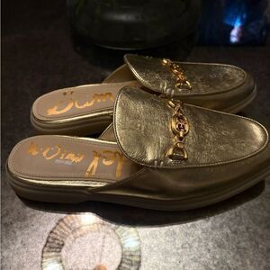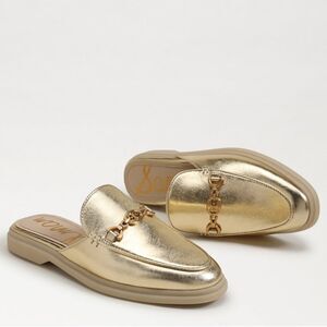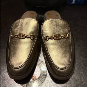 Size 9. Excellent condition. A gleaming metal bit stands out on a trend-savvy mule designed with a streamlined silhouette and moc toe for timeless appeal.