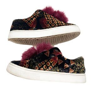 These Sam Edelman Leya Pom Pom shoes are so fun! Velvet fabric, black with diamond and floral prints in gold and purple. The same purple color (maroon/wine) is the Pom Pom on top. Stretch elastic across faux lace up style. Without laces.
