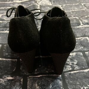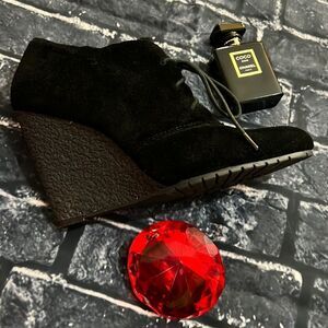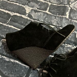 Sam Edelman, black suede wedge, booties with front tie, hood used condition no damage featuring a wedge height of 3 1/2 inches