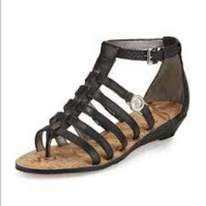 Sam Edelman Donna Gladiator Sandal. A polished logo medallion stands out in the striking vintage inspired profile of a strapping Sandro on a slim wedge. Open toe, suede, multi strap detail, ankle buckle closure, 1” wedge heel, manmade sole