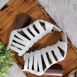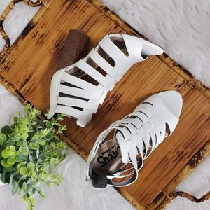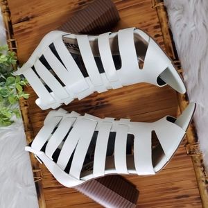 New, Sam Elderman Circus white cut out design leather open toe pumps, like new, with slight yellow glue stains on the side, shown in pics.