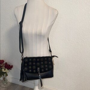 Chic and versatile black crossbody bag with stylish embellishments. Perfect for elevating any outfit.