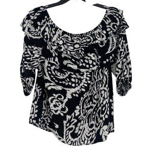 Sam Jess Women's Size Small Black Floral Off The Shoulder Tiered Ruffle Blouse. 100% Rayon. gently preowned no flaws. see photos for approx measurements