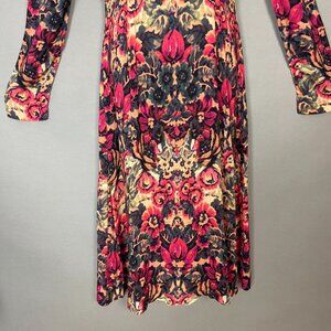 Anthropologie Sam & Lavi Selma midi dress in a floral graphic design. Long sleeves, sheath fit, and two buttons in the back with peekaboo cut-outs.