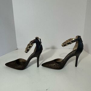 These heels have a pointed toe with a black and gold snakeskin design on them. A gold chain goes around the ankle. There is a zipper on the back of the heel. The heel is 4 inches, the total height of the shoe is 7 inches. Pre-Owned-Excellent condition.