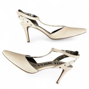 Sam & Libby is a footwear brand that started in the 1980s, originally recognized for its iconic bow ballet flats. Over the years, it has transformed into a contemporary, multi-category shoe brand that provides a diverse array of styles for women and girls, emphasizing both fashion and functionality. You're sure to adore these beige heels! Stylish and playful, these pointed toe shoes come with an ankle strap featuring a buckle, a t-strap design across the foot, and to enhance their appeal, there are silver metal accents adorning the straps. This is a brand new shoe that has never been worn, although it may have some very light staining around the edge of the inner foot-bed. Please take a close look at the photos!