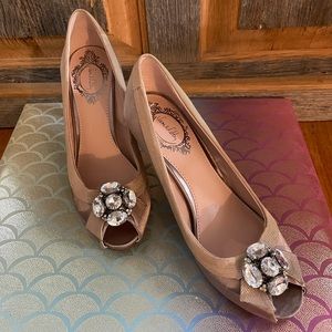 Very gently worn Sam and Libby champagne colored heels with beautiful large rhinestone detail at the toe! I bought these for a wedding and barely wore them for more than a few hours! In excellent shape!! Heel approximately 3 inches