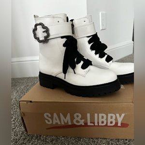 Sam & Libby White bucketed Combat Boots , size 8.5, heavy rubber traction soles, embelished bucket, big black laces, comfort insole, very cool boot, 13/4 inch thick heel, faux leather construction, zip up the inside.