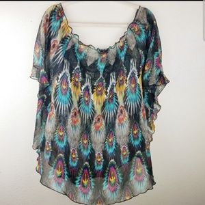 Colorful Peacock feather design. Lace v-neck line. Wide flowy sleeves. Loose relaxed & flowy fit. Length 29" Chest width 21"