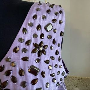 MAX Pretty top with dark rhinestones and metal embellishment! Can tie in back! Pit 22”. Length 30”. Pretty lavender sheen fabric! See photos for description and condition