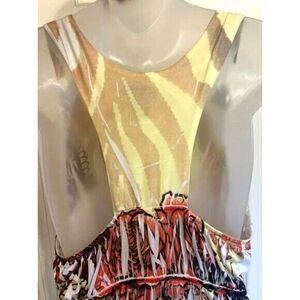 Stand out in this bold Sam & Max maxi dress, size Large, with a colorful collage of leopard print, butterflies, and red roses. Featuring a scoop neck, open racerback, and stretchy waistband for a flowy and flattering fit. Soft polyester-spandex blend. Gently used and in excellent condition.