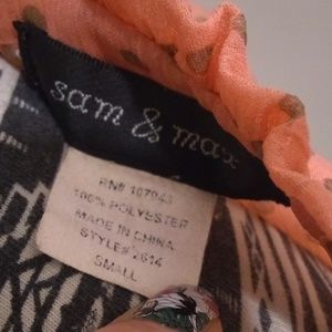 Sheer peach polkadot blouse with deep v-neck, coming in to a stretchy elastic at natural waist and floating down for a very figure flattering fit. Adorable bow detail at the shoulders. Excellent used condition.