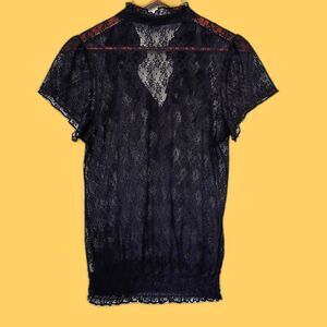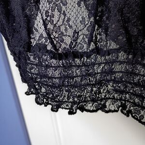 Gothic and romantic, this black lace blouse by Sam Max features a deep V-neck henley style with delicate ruffle trim and stretchy, semi-sheer fabric. Perfect for witchy, dark academia, or gothic-inspired looks. Women’s size large—great for layering over camis or bralettes.