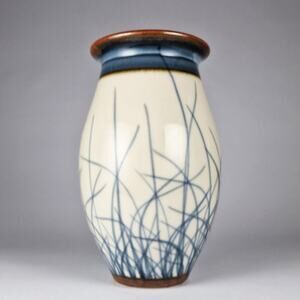 On offer is this lovely studio pottery vase by PNW potter, Sam Scott. A gorgeous porcelain piece; smooth and glossy. Wheel thrown. Features abstract brushwork reminiscent of grass waving in a light breeze. Beige background with cornflower blue and brown. Gorgeous. In excellent preowned condition.