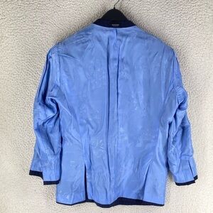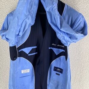 Mens 44 Bespoke Structured Sports Coat. Navy Blue w/ Lt Blue Pinstripes, 2-Button Closure, Pick Stitching, 4-Button Surgeon Cuffs; Dual Vented, Primo Lana Italy Super 150s Wool, Fully-Lined Blazer/ Jacket. All Pockets are Fully Functional.
