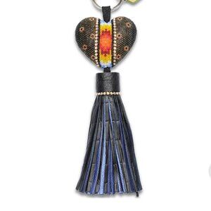 Includes a leather bag tag secured with a hand-woven friendship bracelet