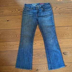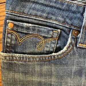 Sam and Billy Riley Low Rise Boot Cut Jeans. Good used condition with no rips, tears or stains. These jeans do have wear on the hems and some wear on one back pocket but they are otherwise in great worn condition. These jeans have a embroidered back pockets and embroidery on the change pocket on the front. Please review the photos for overall wear and approx measurements.