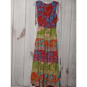 Beautiful bohemian style maxi dress with a tiered, patchwork floral print design in red, blue, green, pink, and orange.
