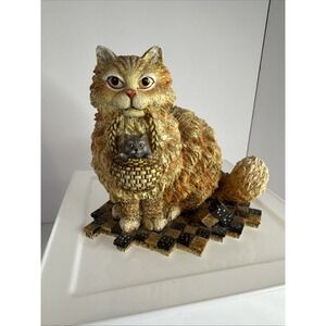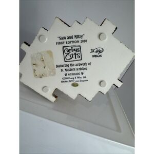 This is a charming vintage figurine of Sam and Mitzy, a pair of curious cats created by D. Masters Kriebel in 2000. The figurine is made of resin and is multicolored, with a folk art style that makes it an adorable addition to any room. It measures 5 inches in height and 6 inches in width, and weighs 2 pounds. This is a first edition figurine from the Curious Cats collection by Lang and Wise, perfect for any collector or cat lover.
