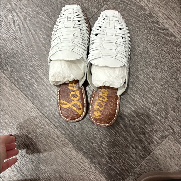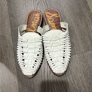Stylish white woven slip-on sandals with a brown insole. Perfect for casual outings.