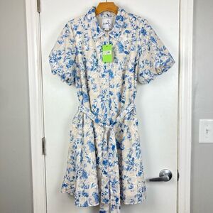 Sam Edelman Floral Print Embroidered Eyelet Puff Short Sleeve Mini Shirtdress in Kou White and Blue