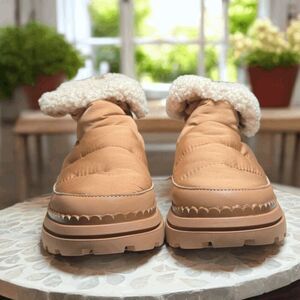 Sam Edelman Ozie, quilted bootie women, sherpa fold-over boots, cozy winter boots tan, insulated ankle boot, pull-on back zip boot, size 8.5 women’s Ozie, chunky sole boots, faux shearling boots, winter fashion boots. Snow, Winter, cold weather, ski trip, snowboarding, Uggs, cozy, revolve, influencer.