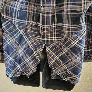 This is a long sleeved plaid button-down shirt by Sam Edelman.  It is blue, yellow, and white and has pockets on each side of the chest.